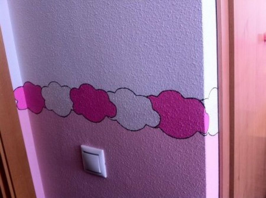 La usuaria Lucineira ha pintado una bella cenefa de animales alrededor de todo el cuarto de su hijo. Lo ha hecho a media altura, por encima la cama y los muebles y lo ha complementado con enormes pegatinas de muñecos tanto por encima como por debajo. El resultado es un alegre y ameno conjunto.La amiga Yoly4 ha optado por hacer un cuarto enteramente en rosa. Cansada de comprar las cenefas que tarde o temprano se despegarán, decidió pintar ella misma unas nubes encadenadas. Para darle vivacidad, ha repasados los bordes haciendo el contorno en negro, el cual destaca mucho más sobre el fondo claro.