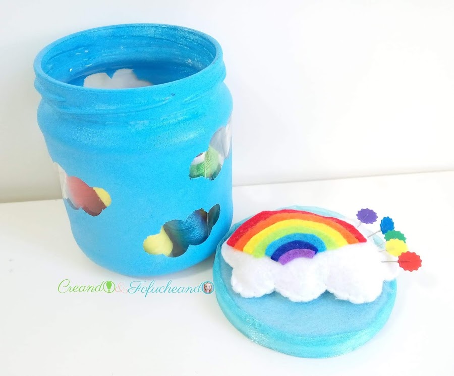 Reciclaje Frasco de Cristal - Alfiletero de Arcoiris de Creando y Fofucheando.