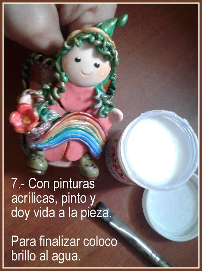 Con pinturas acrílicas pinto el arcoíris, pero aprovecho a darle detalle a zapatos, cesta, cabello...