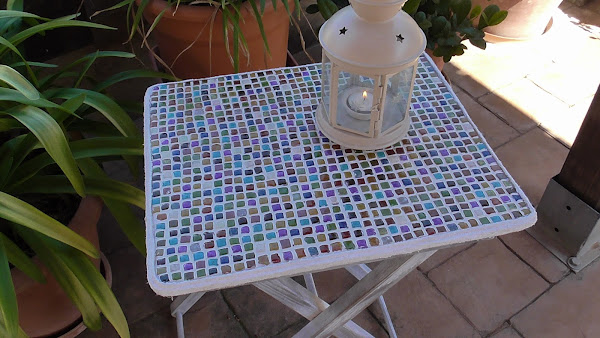 Hoy os traigo un trabajo de doble reciclaje. Vamos a reciclar y restaurar una pequeña mesa de madera que estaba dañada y lo haremos con las teselas que hemos hecho reciclando viejos CDs. Aquí os dejo un enlace al tutorial de cómo hacer estas teselas enlace.