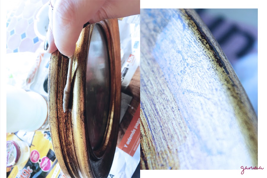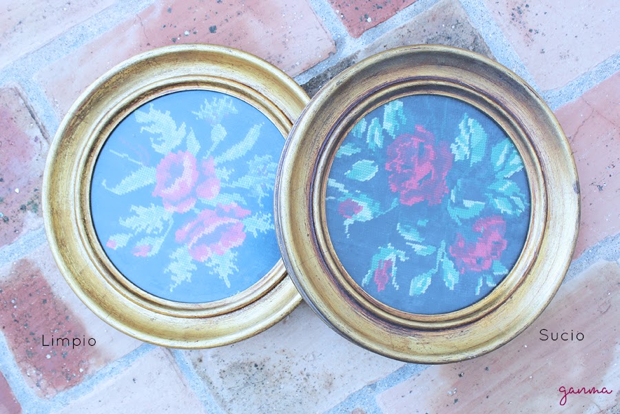 Con un palito y un poco de algodón vamos limpiando con cuidado todo el marco insistiendo en las zonas mas oscuras. Cuando terminamos pasamos un trapito húmedo y secamos bien para frenar la actuación del jabón y no dañe la capa dorada. Esto lo haremos cada vez que dejemos de trabajar.