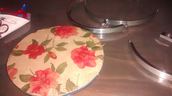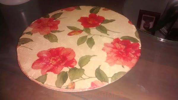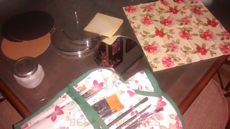 3º Pegar la servilleta elegida con cola blanca mezclada con un poquito de agua, extendiendo con un pincel o brocha. Recortar hasta dejar del mismo tamaño que el cartón. Se puede cortar la servilleta primero y después pegar en el cartón.