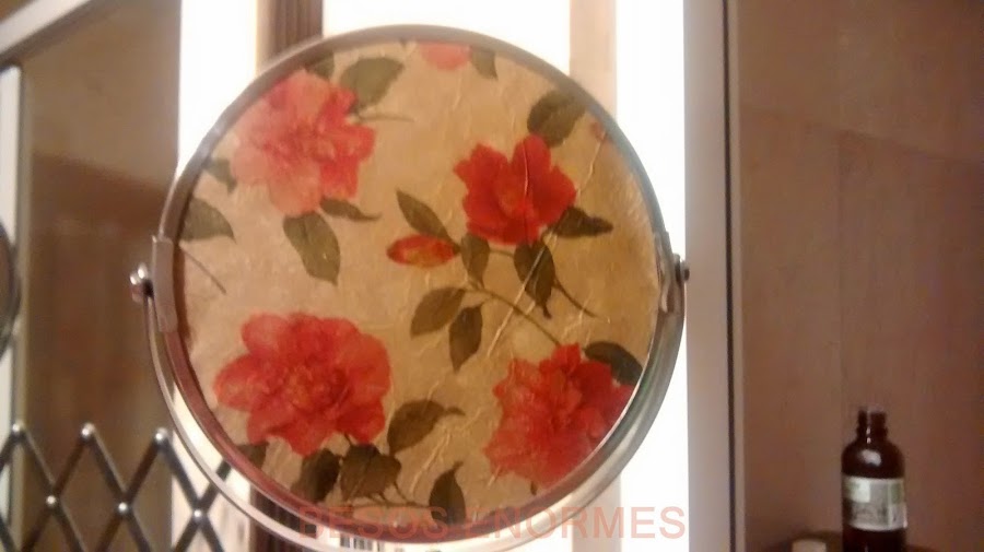 Tengo un espejo de pared en el baño, uno se sus lados estaba roto pero se podía seguir usando. Hace unos días cayó al suelo y la parte que estaba rota se descoloco haciéndose una ceja o escalón que podía cortar. Así que me puse manos a la obra sustituyendo el espejo roto por un cartón con decoupage. El resultado me encanta. espero que a vosotros también.
