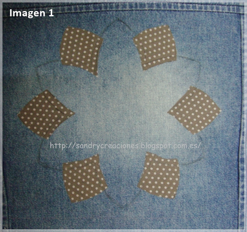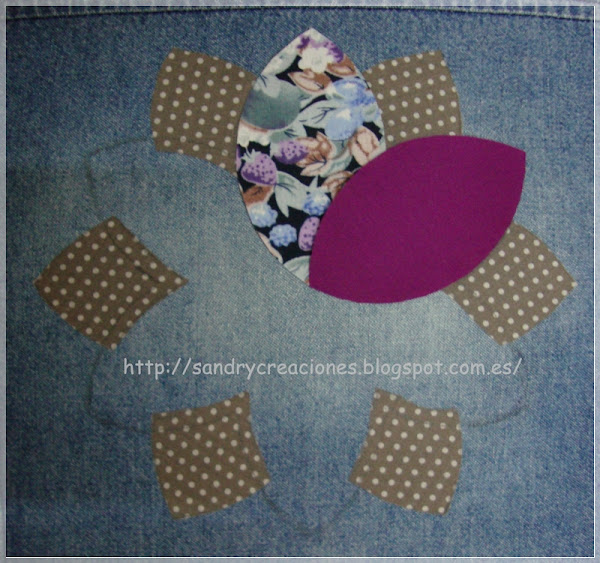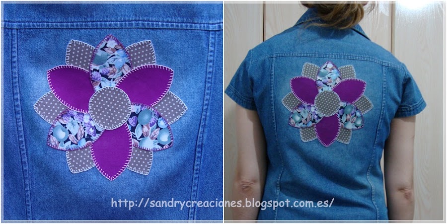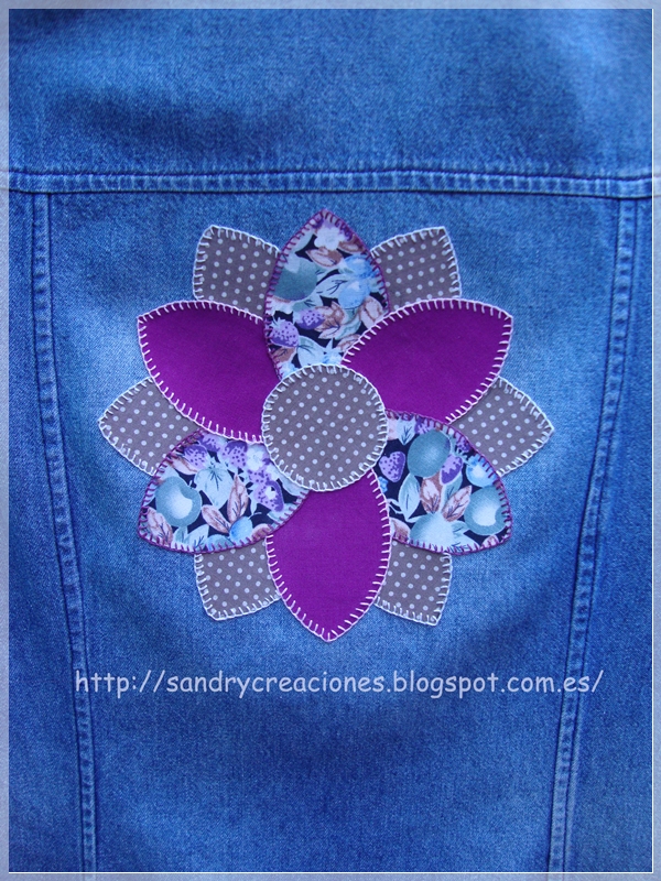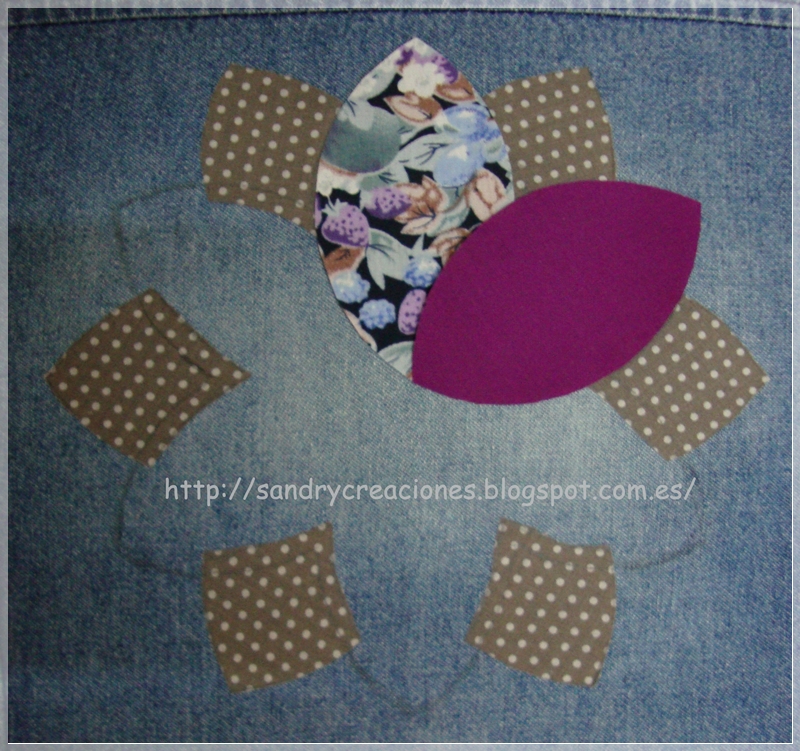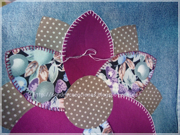Una vez todas las piezas pegadas las decoré con punto festón con hilos de colores que combinaran y al mismo tiempo contrastaran con los colores de la flor y del vestido tejano, como podéis ver en esta foto: