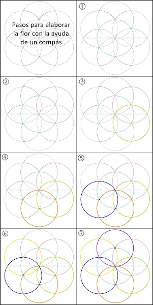 Para hacerla así con compás es muy fácil: primero dibujáis con la ayuda de un compás una circunferencia central. Seguidamente con la misma medida de compás que habéis hecho realizáis otra circunferencia cogiendo como centro cualquier punto de la circunferencia central. A partir de ahí vais haciendo circunferencias de la misma medida cogiendo como centro donde se cruza la anterior circunferencia realizada con la del centro. Aquí os dejo un paso a paso para que podáis ver más o menos su procedimiento, marcando en colores a cada paso el orden de la realización de las circunferencias, y con una x del mismo color de la circunferencia dónde tiene el centro cada circunferencia: