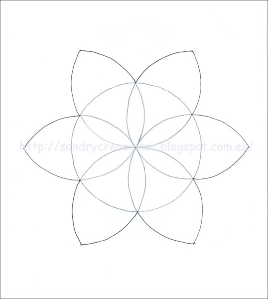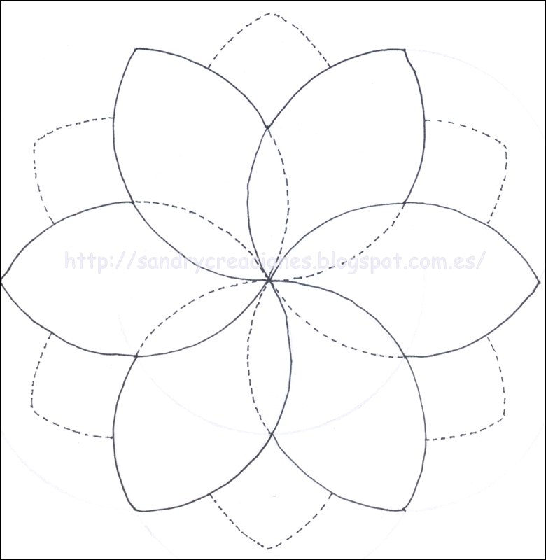En la imagen siguiente he marcado con líneas discontinuas las partes de los pétalos que se superpondrán y que quedarán por debajo y también con línea discontinua podéis ver dibujados los medios pétalos que añadí para que la flor quedara más llena. Seguramente si buscáramos encontraríamos que estos pétalos que he querido añadir de más también se podrían elaborar haciendo más circunferencias con el compás pero como tampoco quería complicarme mucho decidí dibujarlos a mano.