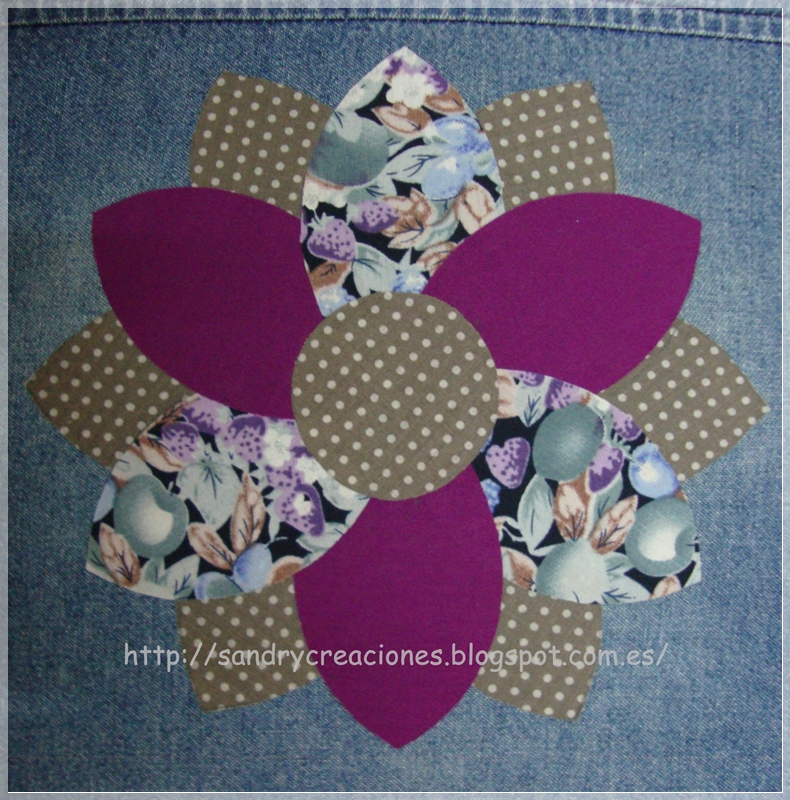 Recorté 1 patrón de cada y las dibujé en la fliselina: 1 pieza del centro de la flor, 6 medios pétalos y 6 pétalos de la flor para pegarlos en la ropa. Para quien no sepa que es la fliselina y para qué sirve es una especie de entretela fina autoadhesiva por las 2 caras (hay de más tipos pero esta es la más utilizada para aplicaciones de patchwork) que sirve para pegar con la plancha dos piezas de ropa.