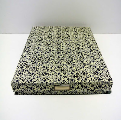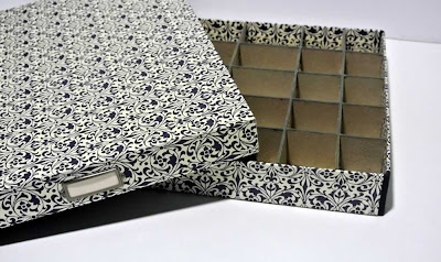 Este fue el resultado de la caja. Lleva un letrero para poner el color de los botones. Los separadores son los que había, ya que Elena quiso mantenerlos y entinté los cantos en azul para que no se vieran tan estropeados.