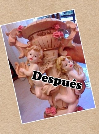 Los candelabros están moldeados en resina plástica, son hermosos tienen dos angeles-querubines y cada uno toca un instrumento, a ellos sólo les retoqué el color del cabello y los labios de un rosa tierno, la piel se la dejé tal cual para diferenciarlos del candelabro. Están bordeados de pequeñas rosas con hojas verdes que ya estaban bien pálidas y como puede verse en la segunda imagen al realzar el color ya lucen bastantes coloridas.