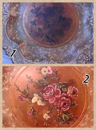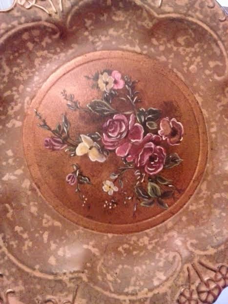En este platón que por cierto es de metal, podrán notar que estaba totalmente borrosa la pintura simplemente les pinté un ramillete de rosas y flores parecidos a lo que pude captar en la imagen de fondo.