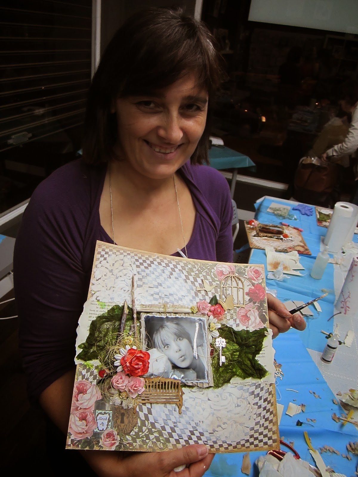 Y el tercer día, el domingo a las 9:30 de la mañana empezamos con el segundo turno para hacer el álbum de fotos. Las chicas vinieron muy inspiradas y hicieron unos trabajos impresionantes. Parecía que llevaban ya tiempo trabajando con el Mixed Media porque me sorprendieron mucho de cómo manejaban las herramientas y utilizaban las tintas.