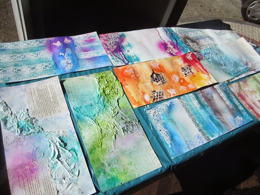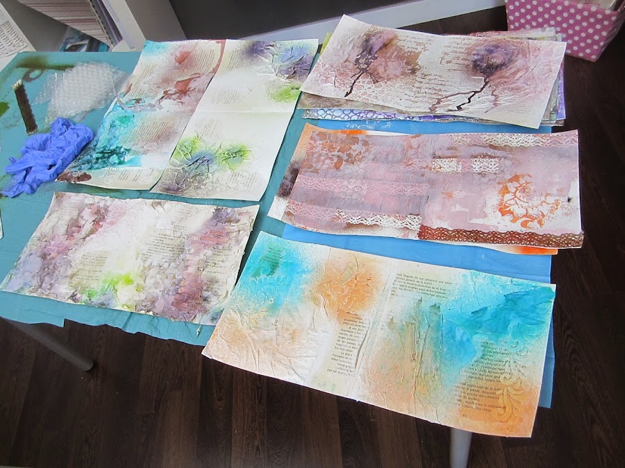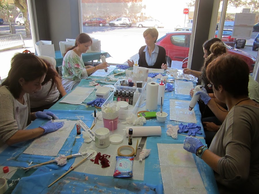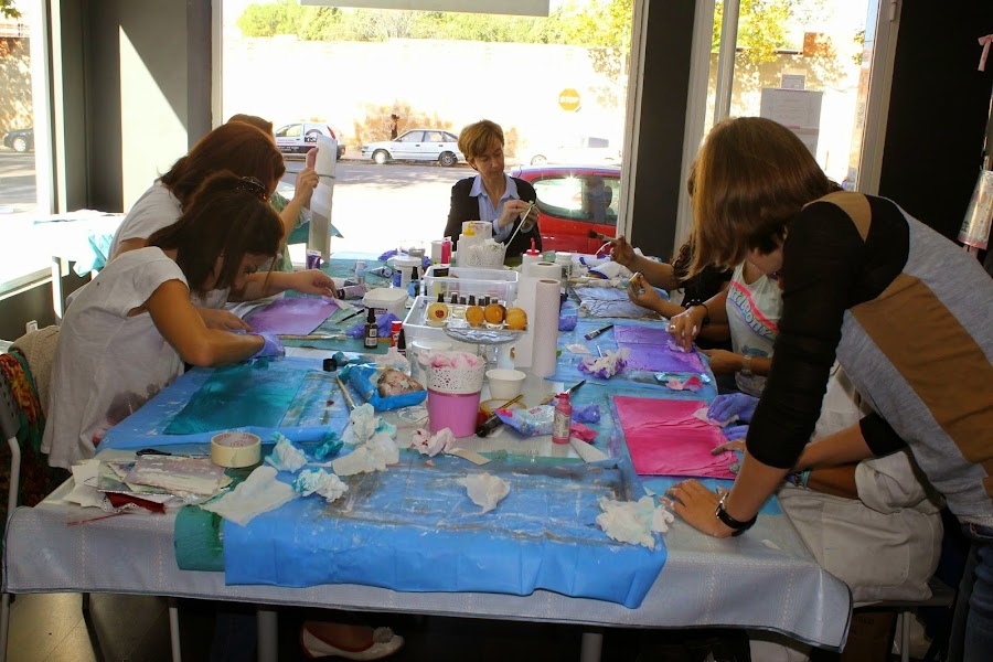 Al día siguiente por la mañana estuvimos haciendo el álbum de fotos, con muchísimas técnicas de Mixed Media. Utilizamos materiales cotidianos que se pueden encontrar en cada casa, como tela, gasa, papel de aluminio, botones, encaje, etc. Además nos sumergimos en el mar del los colores descubriendo el mágico mundo de las tintas de spray, pintura acrílica, plantillas, gesso y pasta de relieve. Creamos unos fondos sorprendentes, y sobretodo reímos y disfrutamos en buena compañía.