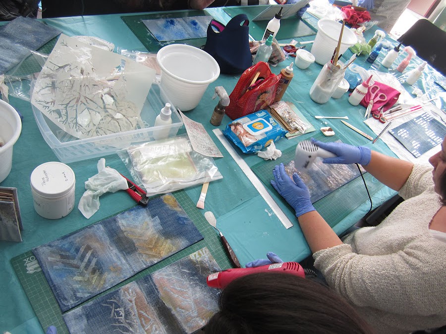 Empezamos el taller con mucha ilusión y ganas. Conforme las cosas iban saliendo y se veían los primeros resultados, a las chicas les gustaba más y más. Utilizaron plantillas, pastas de modelar, gesso, sellos, sprays de colores....