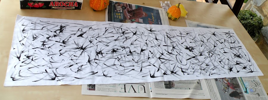 Luego queda hacer la parte de los anillos. Para ello lo primero que hace falta es una tela, y como mi madre no tenía ninguna que me gustara la pinté a partir de una pieza blanca, usando pintura negra a brochazos.