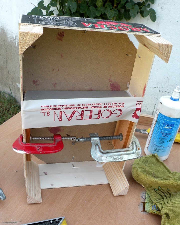 Estas piezas se pegan luego en los laterales de la caja con cola y se sujetan bien hasta que sequen. En realidad, para que quedase mejor, hice también una trasera con cartón-madera, que ya teníamos experiencia y no nos costó nada... así que no voy a pegarlo hasta que no tenga decorada esta pieza.