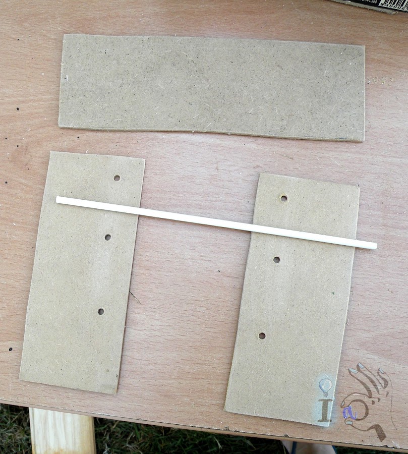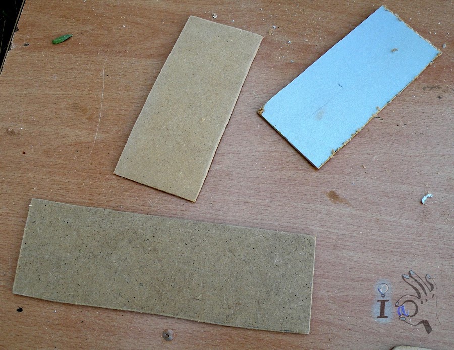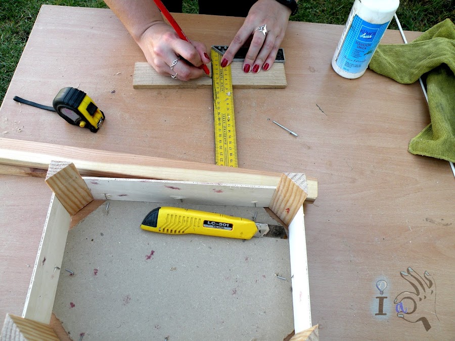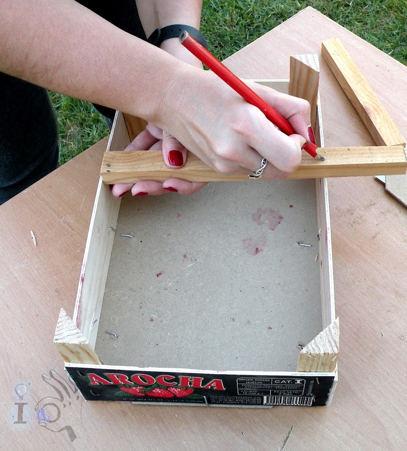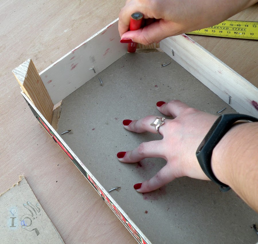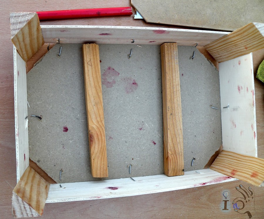 Luego, sobre estos listones pegaremos nuestra pieza de cartón-madera, pero como va a ir decorada es más fácil decorarla antes de pegarla.