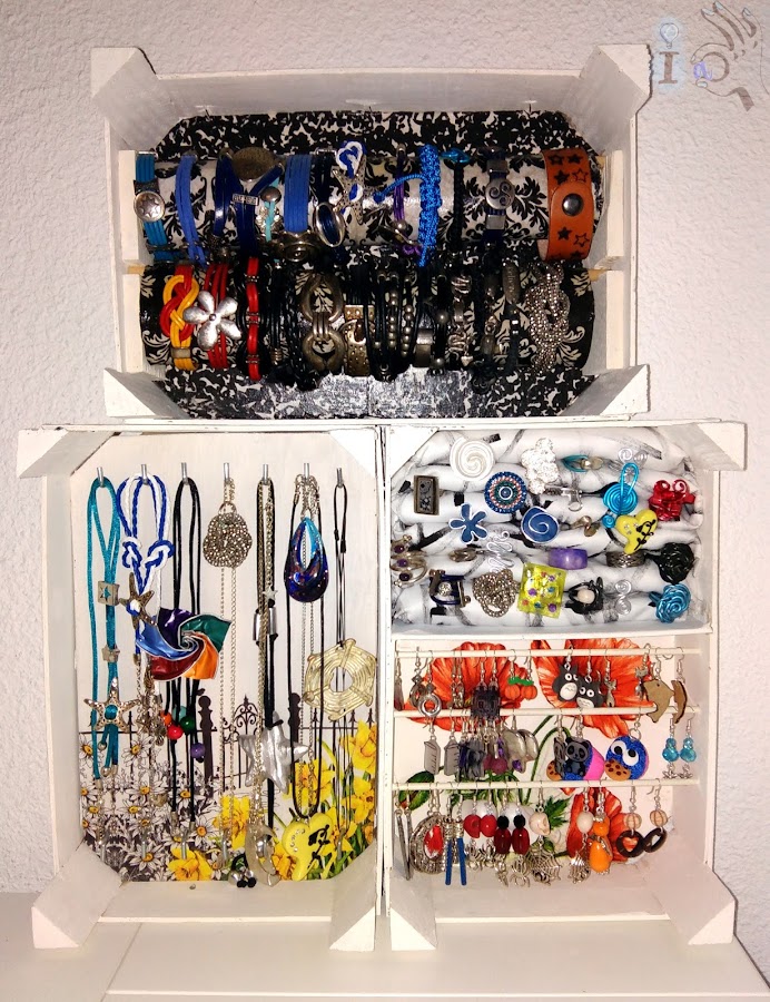 Como os digo ellos siempre reutilizan materiales de casa que si no se tirarían, así que yo he decidido usar unas cajas de fresas para hacer un organizador de accesorios, porque como imaginareis tengo un montón, y si no los tengo a la vista se me olvida que los tengo y no los uso. El resultado es el que veis a continuación: