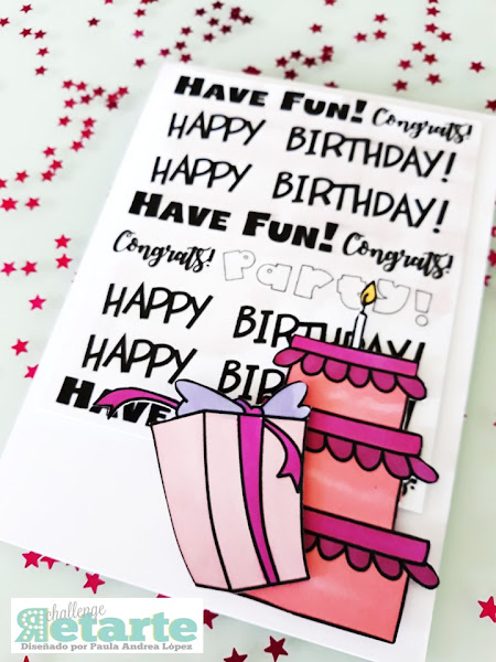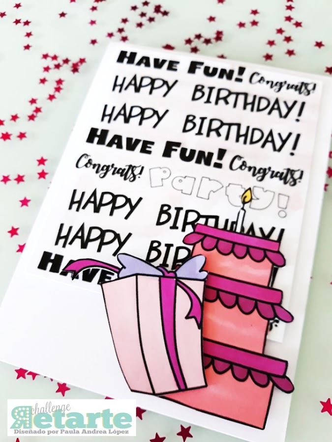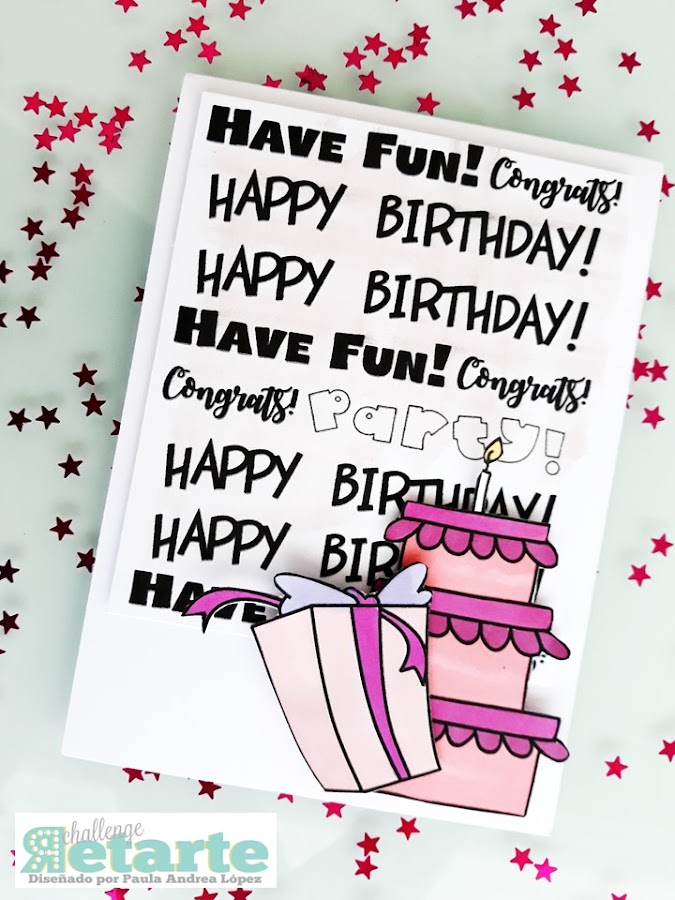 Diagrame las diferentes palabras del Kit Carl Party dentro del formato usado y sobrepuse como la segunda capa de la tarjeta. Con las tintas suaves de agua le aplique una suave capa de color y por último pinté de rosa, recorte y pegue a diferentes alturas dos de las imágenes de los digis del kit.