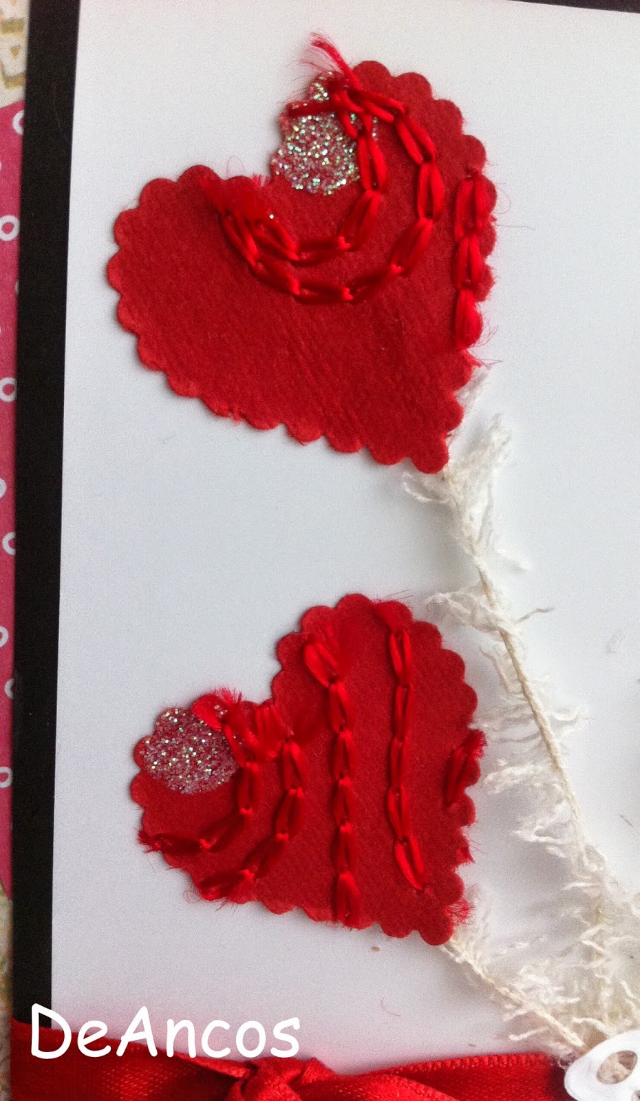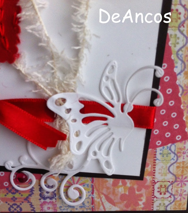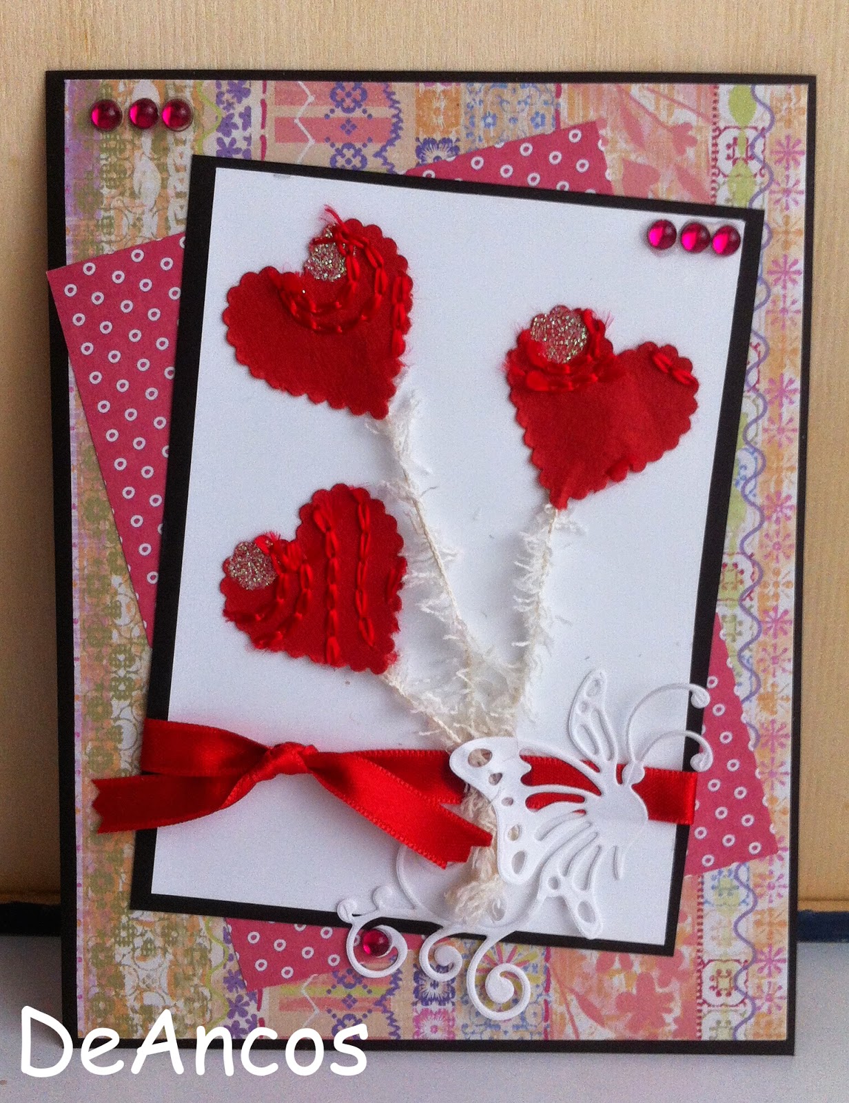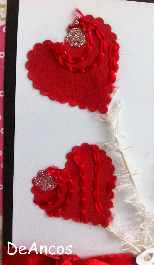 He querido presentar los corazones, troquelados en un papel japonés cosido y con redondeles brillantes, como globos que están sujetos a la mariposa de la parte inferior.