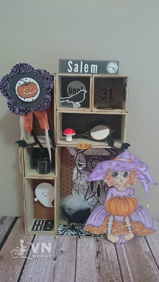 Finalmente me puse a decorar la caja. Papeles con los colores negro, morado y naranja para las bases y luego en cada cajita adornos de Halloween para que pasemos un poco de miedo.