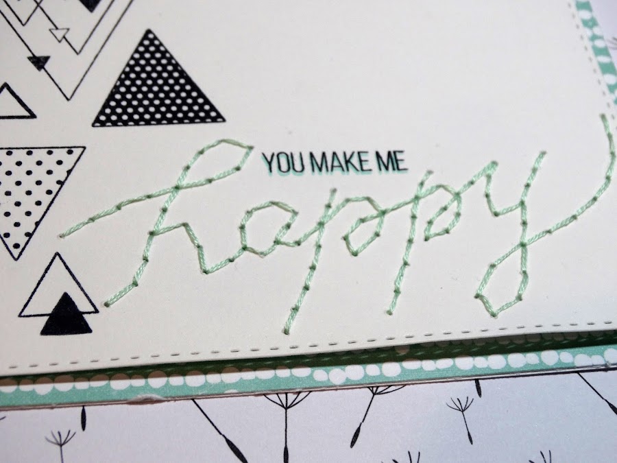 Como veis, el hilo está cosido a mano. El sentimiento lo estampé primero en verde y luego por encima en negro para que quedara como una sombrita y, por último, estampé los triángulos.
