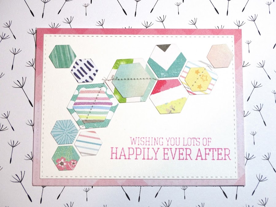 Para la segunda tarjeta usé unos hexágonos que troquelé con restos de papeles, los puse de forma que me gustase el diseño y estampé el sentimiento.