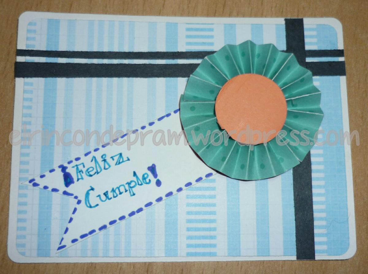 Es muy fácil: sobre una cartulina blanca de 12 x 9 cm, he pegado un papel decorado. A éste le he añadido unas tiras de cartulina y un rosetón con un banderín para el sentimiento.