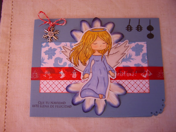 Para hacer la tarjeta he usado: Papeles de la colección g.c.d, "homespun chic" y cartulina texturizada azul, whasi tape cristmas, y un esquinaro para redondear las puntas de la tarjeta, los papeles están entintados con Distress broken china y worn lipstick, en el centro he partido por la mitad una flor grande de prima, un sello de un ángel coloreado con copics (mi tercer sello pintado), para el pelo: Y21,YR23,E35, para la piel: E00, E21, E11,R11, el vestido: B93, B95, B97, las alas y las sombras con: C1, W1, W3, un charm de copo de nieve cosido y los sellos de las bolas de navidad junto con la frase al pie de la tarjeta son de sello de navidad de Latina Craft, tienen una calidad de sellado genial!! os los recomiendo lo mejor estan en Castellano, bueno eso es todo espero vuestros comentarios. Besos.