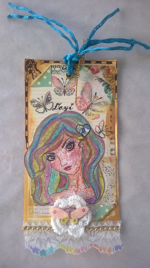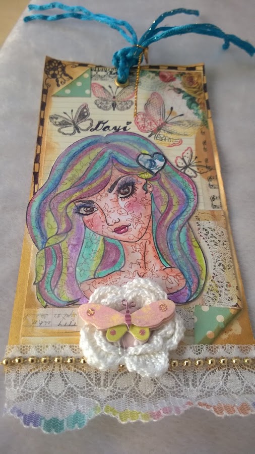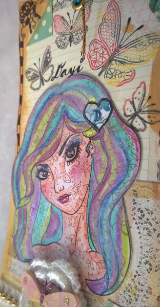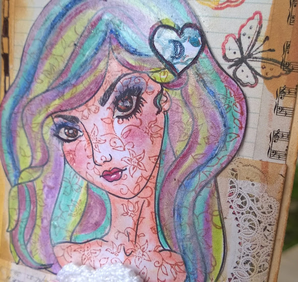 Utlicé el digie de nuestro patrocinante que me pareció super bello... Y desde que lo vi, decidí que quería hacerle el cabello de varios colores.. Estampé primero un sello de flores en todo el digie y después con mis creyones acuarelables le di vida.. Utilicé papelitos de la colección "Find your wings and fly" de My Minds Eye y lo llené de detallitos: una flor tejida, perla corrida en dorado, encaje..