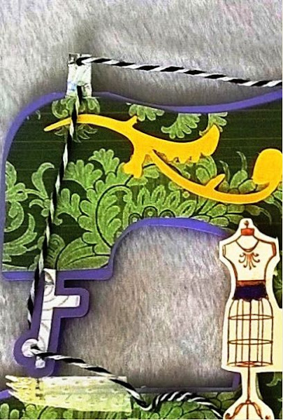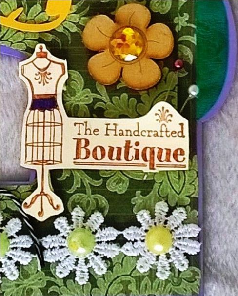 Le agregué bastantes detalles, como ese corte en forma de flourish que ven arriba en amarillo, el twine en blanco y negro a modo de hilo, un pequeño encaje que pareciera estar cosiéndose, una bellísima flor en madera (del premio reciente recibido de Piensa Scrap) a la que agregué una piedra brillante en el centro, abajo flores de tela cada una con una media perla en verde tornasol; y para completar todo el proyecto un sello que compré hace poco de Inkadinkado y que me fascina: "The Handcrafted Boutique" combinado con un maniquí del mismo set, estampados en tinta Memento marrón y le agregué 2 alfileres a la derecha muy a juego con el tema de la tarjeta.