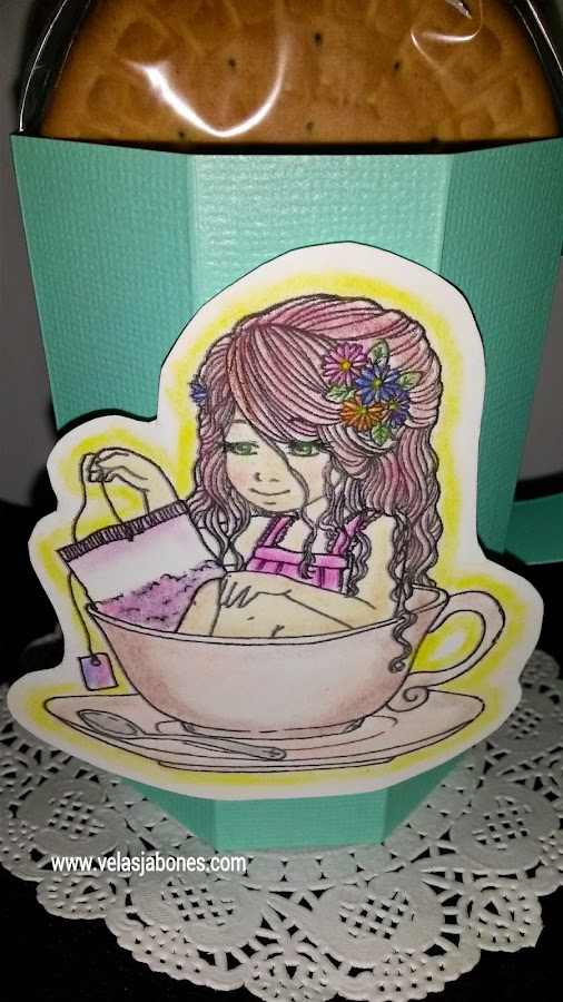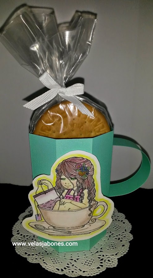 Estoy participando en el reto 8 de Zuri Artsy Craftsy el proyecto debe tener una taza o una tetera ya que el tema es Fiesta de te. Confeccione este proyecto 3D, es un dulcero en forma de taza. Decorado con un "doily" y "Jazmín" un sello digital (digi) de la colección de "freebies" de Zuri Artsy Craftsy. Les cuento que es la primera vez que coloreo un "digi", utilice tizas "pastel" para colorear a "Jazmín". Para darle un toque de fantasía, bueno en realidad voy a confesar que soy adicta al brillo, aplique "glitter" iridiscente en la bolsa de te; una pena que no se aprecie en las fotografías. Les dejo con dos imágenes más, la primera es un acercamiento del "digi" y la segunda es la taza sin las galletas. Hasta luego y espero que puedan disfrutar de un rico te con galletitas. Bye.