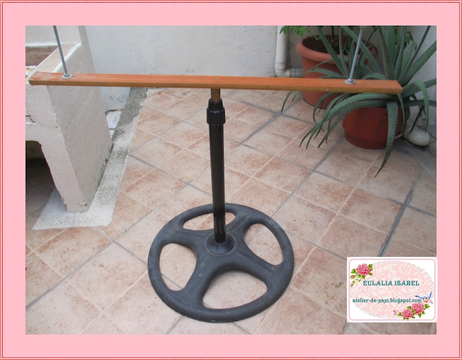 Tome una base de ventilador, a la cual le añadi una tira de madera , coloque en cada extremo de la tira, 2 tornillos largos, uno en cada extremo, la distancia entre ellos es la DEL OVILLO DE LANA estirado.