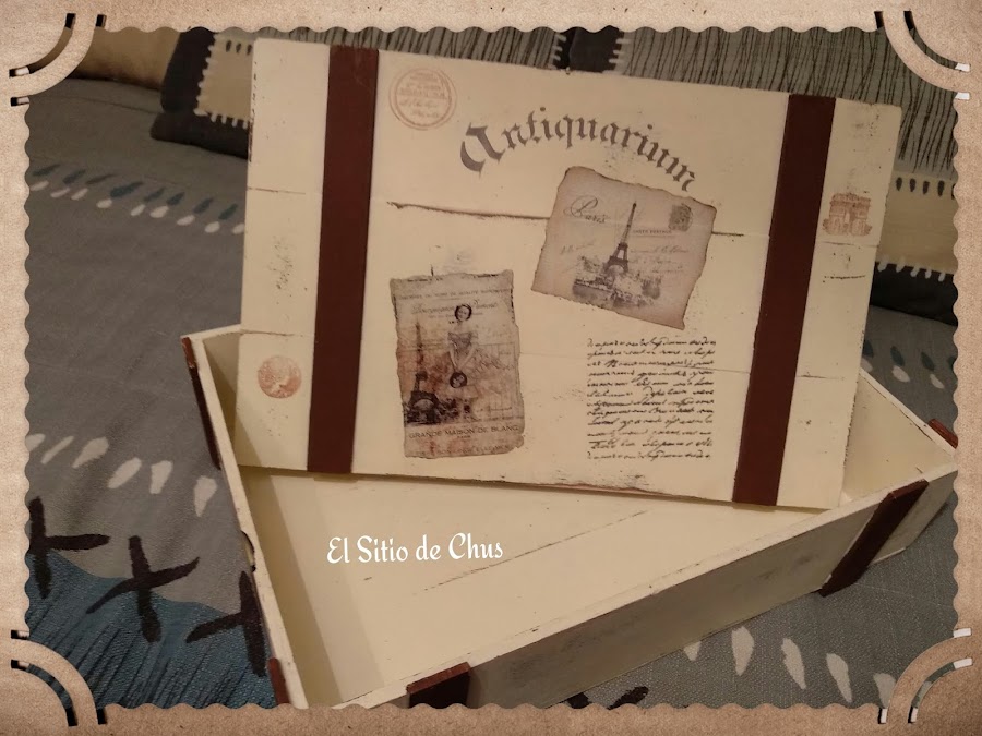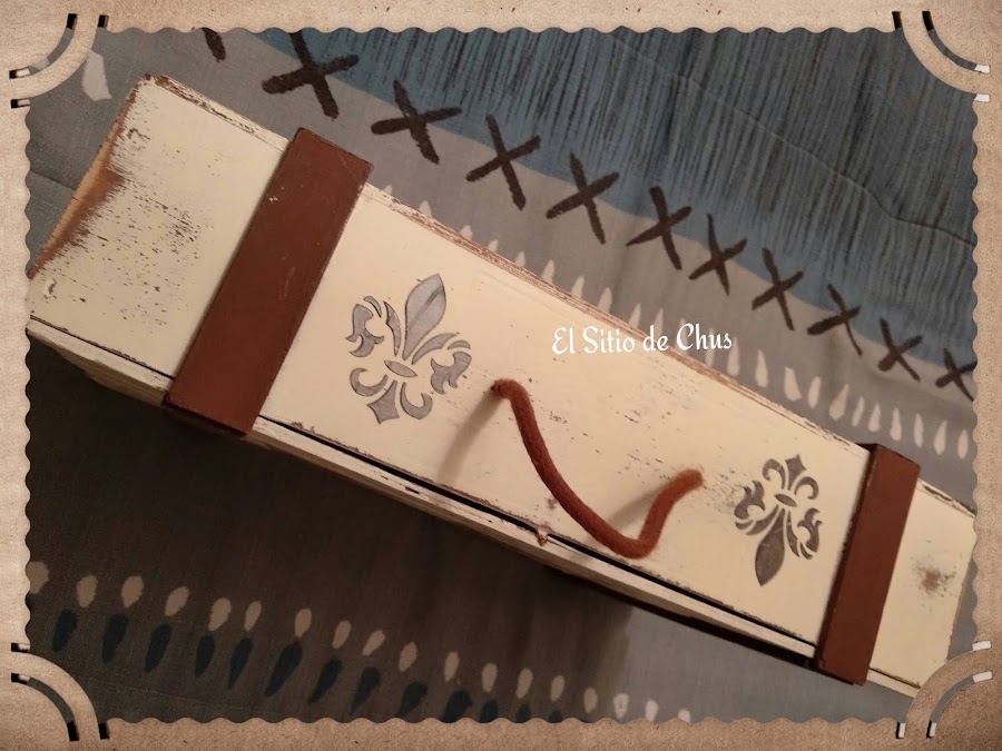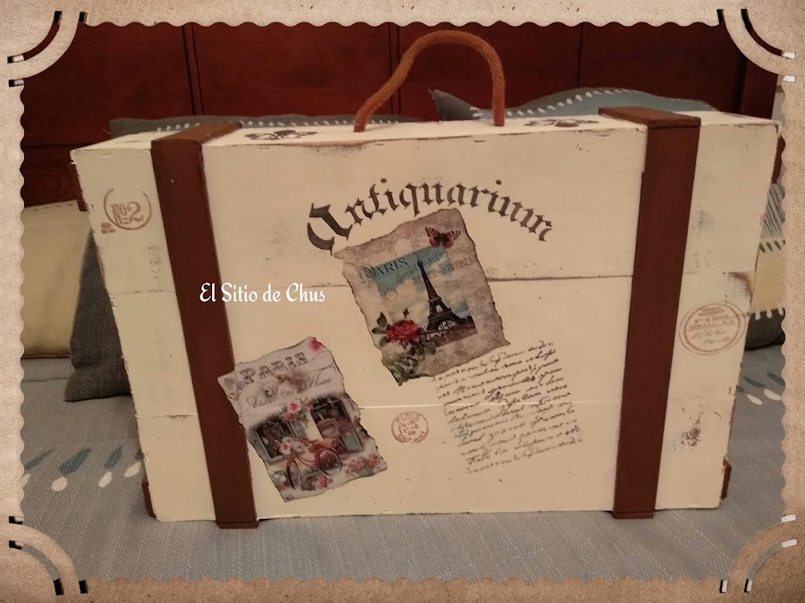 La caja como ya os dije era de vino, de madera con listones, que fueron lo que me dio la idea de convertirla en maleta. La mía era clarita, pero para que os hagáis una idea vale igual en oscuro.