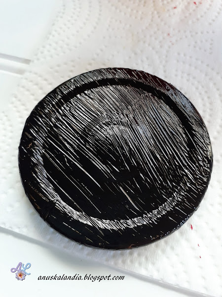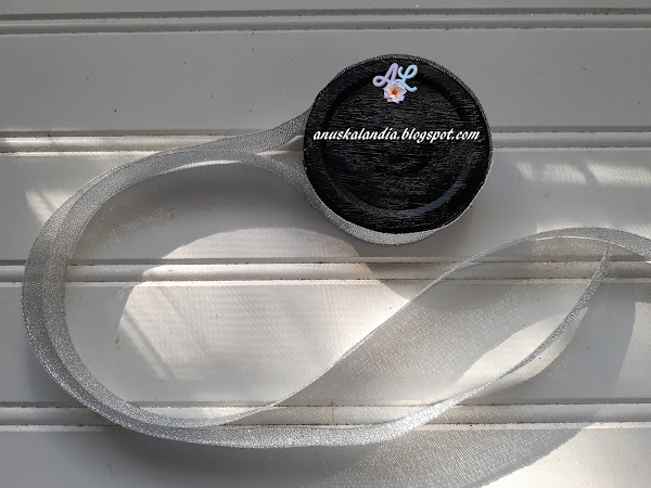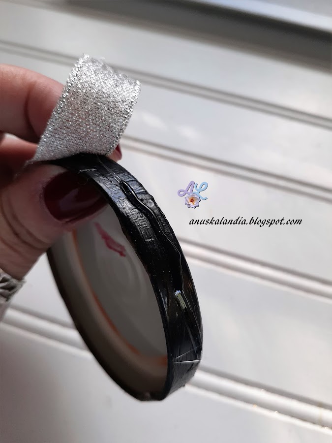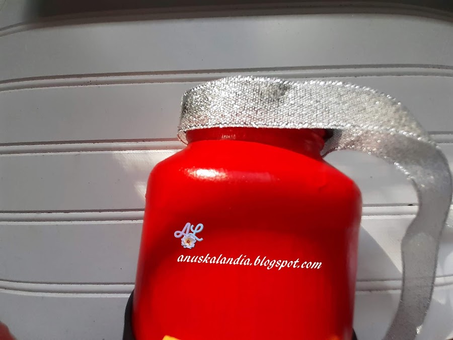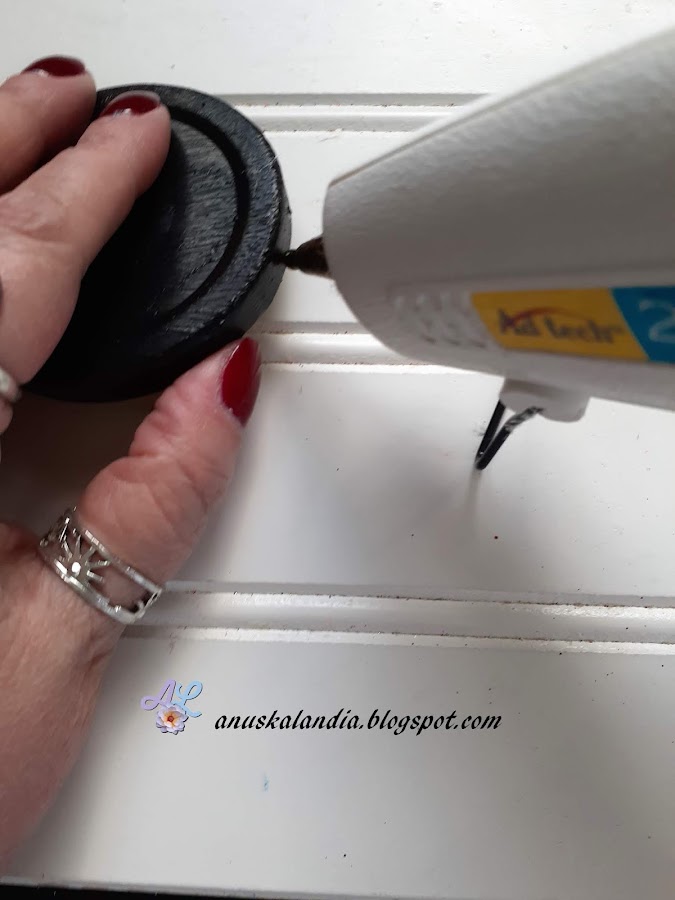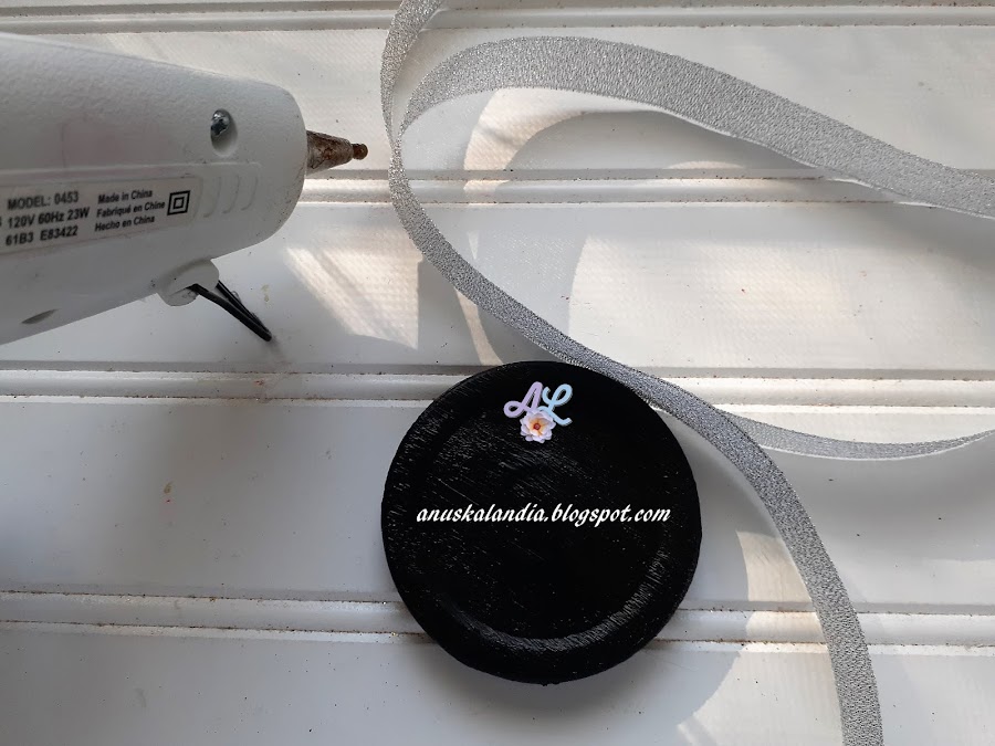 7. Vamos a pegar una cinta para hacer un lazo en la tapa. Ponemos silicona alrededor de la tapa. Pegamos la cinta. Colocamos la tapa en el frasco y hacemos una lazada.