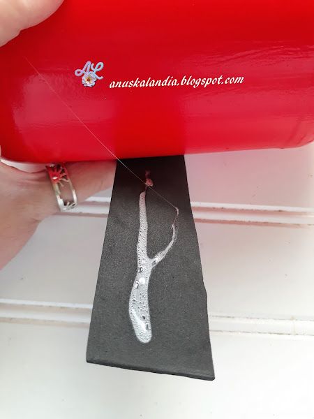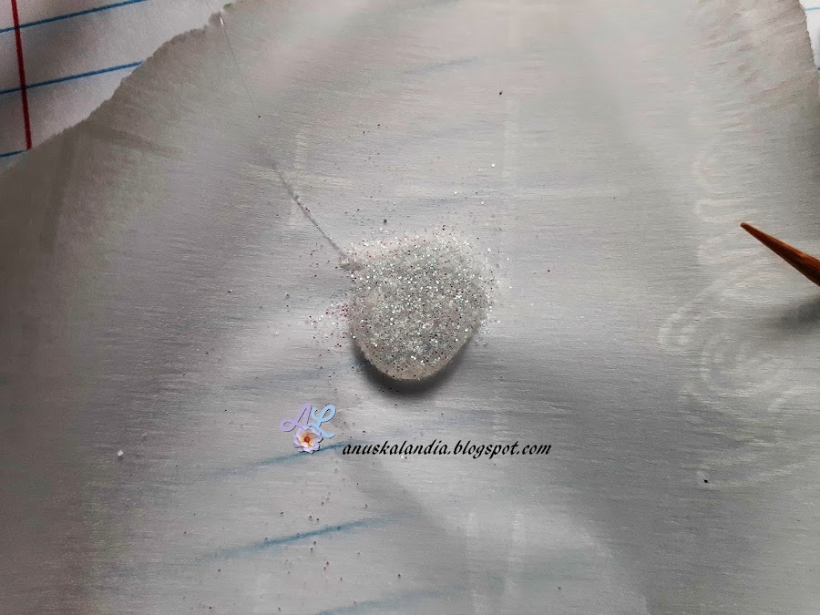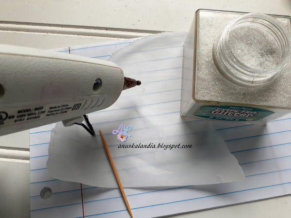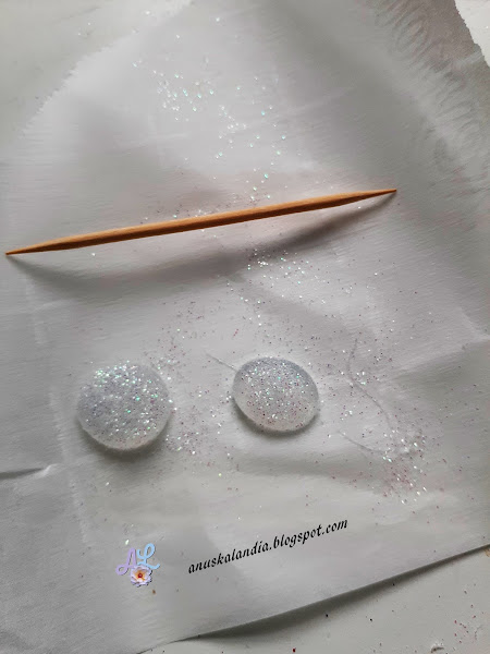 8.- El siguiente paso es opcional. He hecho los botones con silicona caliente. Tu puedes poner botones normales. Echamos silicona en un trozo de papel de horno o parchment paper y rapidamente procedemos a echar por encima purpurina blanca. Hacemos dos agujeros con un palito de brocheta. Dejamos secar. Posteriormente, pegamos con pizca de silicona al frasco.