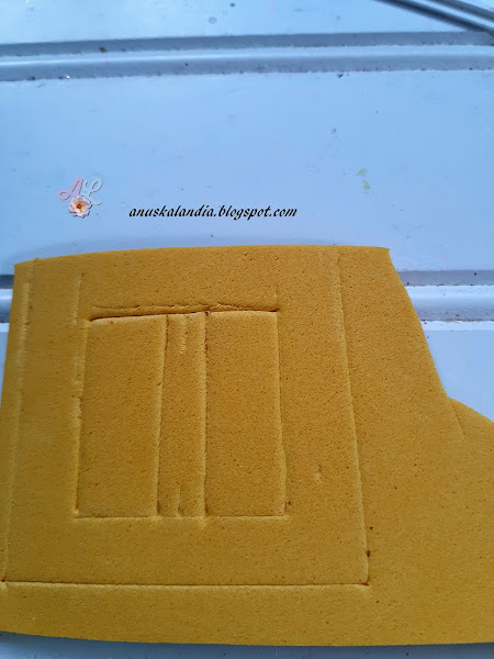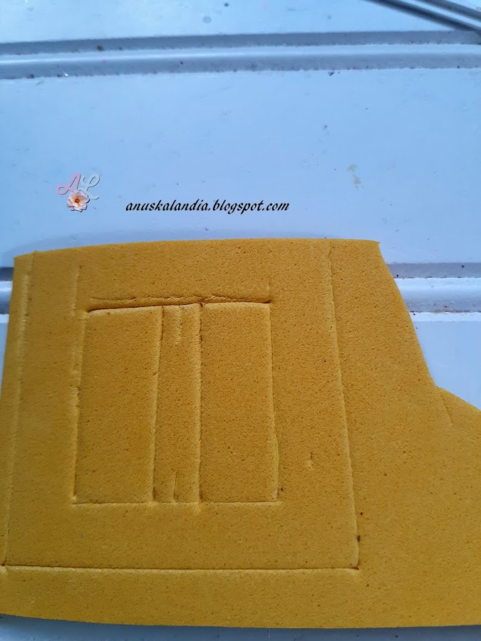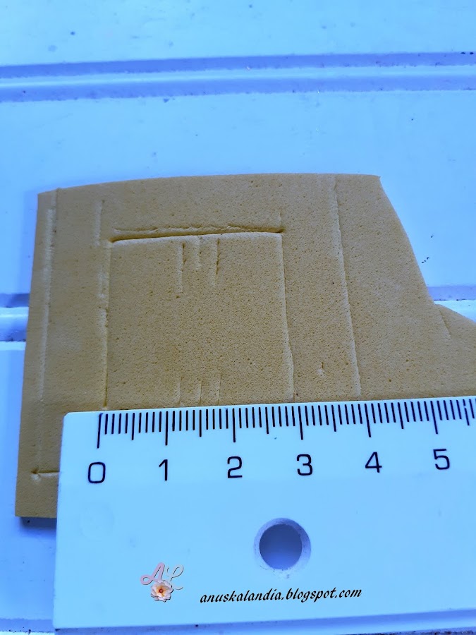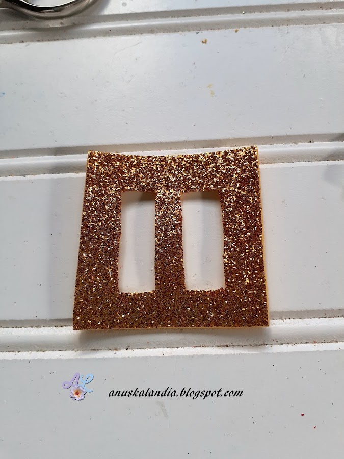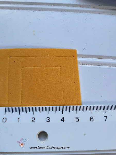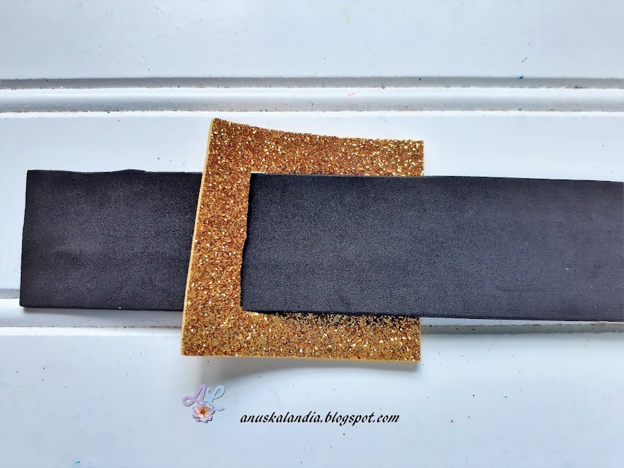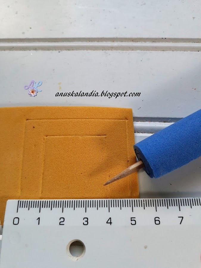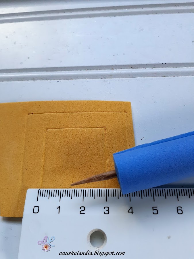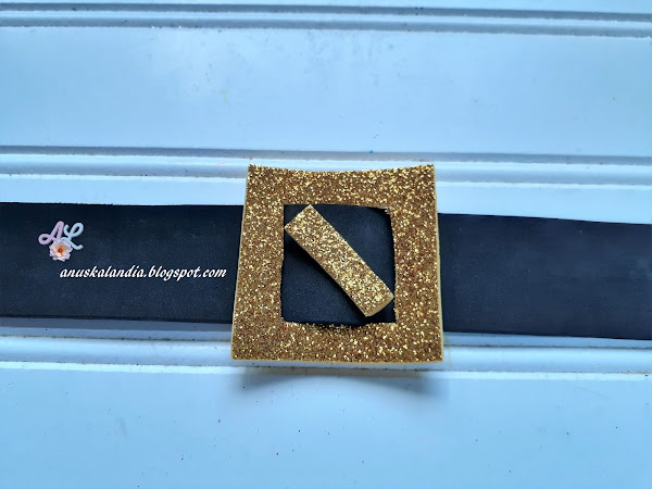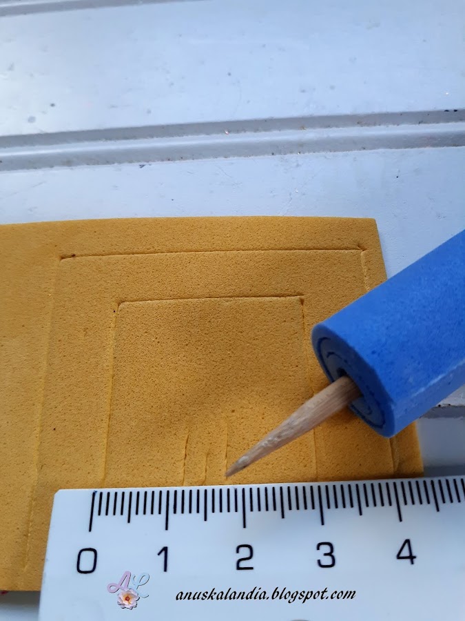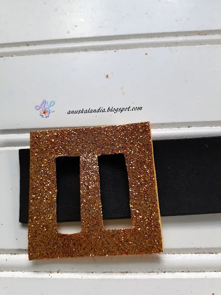 3.- Ahora cortamos la hebilla del cinturón en goma eva dorada. Marcamos un cuadrado de 5 cm. x 5 cm. y un cuadrado centrado interior de 3 cm. x 3 cm. Marcamos a 1,5 cm. en ese cuadrado y volvemos a marcar 3 rayas a cada lado de esa marca central. Marcamos y cortamos.