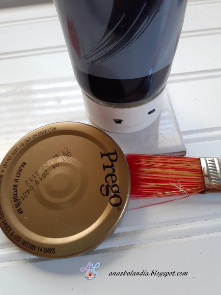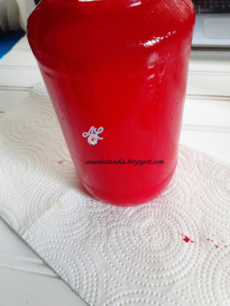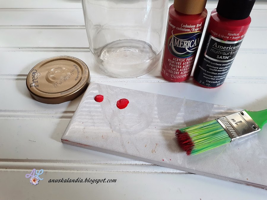 1.- Ponemos pintura del rojo de nuestra elección, en mi caso, en mi inseparable Rodi, y con brocha o con esponja (a tu elección) pintaremos el frasco de arriba a abajo. Lo mismo haremos con la tapa y la pintura negra.