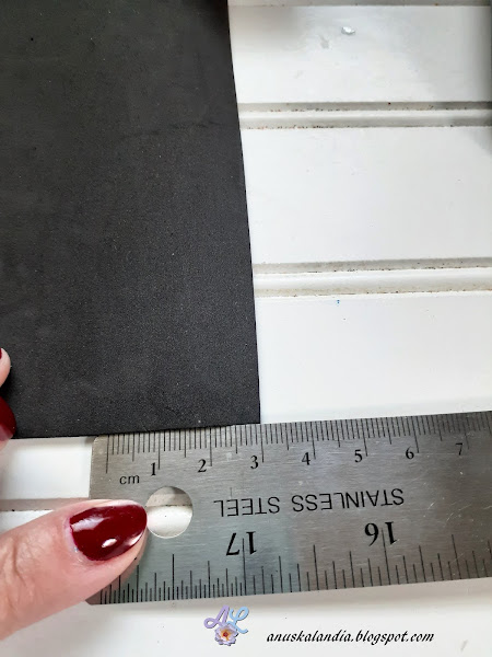 2.- Vamos a hacer el cinturón de Santa. Medimos el frasco alrededor. Con esa medida (en mi caso 28 cm. x 3 cm. de alto) cortamos una tira de este tamaño en goma eva negra, cortar con regla y cúter, para que el corte sea más recto. Es opcional, puedes cortar con tijeras.