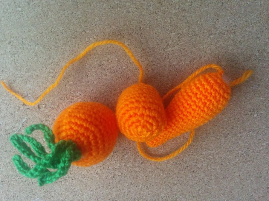 Las zanahorias también son muy sencillas, la completa es simplemente ir aumentando desde un anillo mágico de 6 puntos, pero sin aumentar en todas las vueltas para hacer la forma alargada. Las otras dos son similares pero simplemente cortadas a la mitad. Las raíces verdes son cadenetas y la vuelta de puntos bajos.