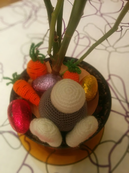 Para finalizar he pintado con sombra de ojos rosa las patitas y las manchas de las zanahorias está hechas con rotulador negro. En el modelo estaba colocado en un bol con los bordes de ganchillo pero como no tenía mucho tiempo lo he colocado todo en una maceta que tengo en el comedor y que está un poco chuchurría pero el conjunto me ha gustado. Los huevos son de chocolate que les daremos buena cuenta el Domingo de Pascua.