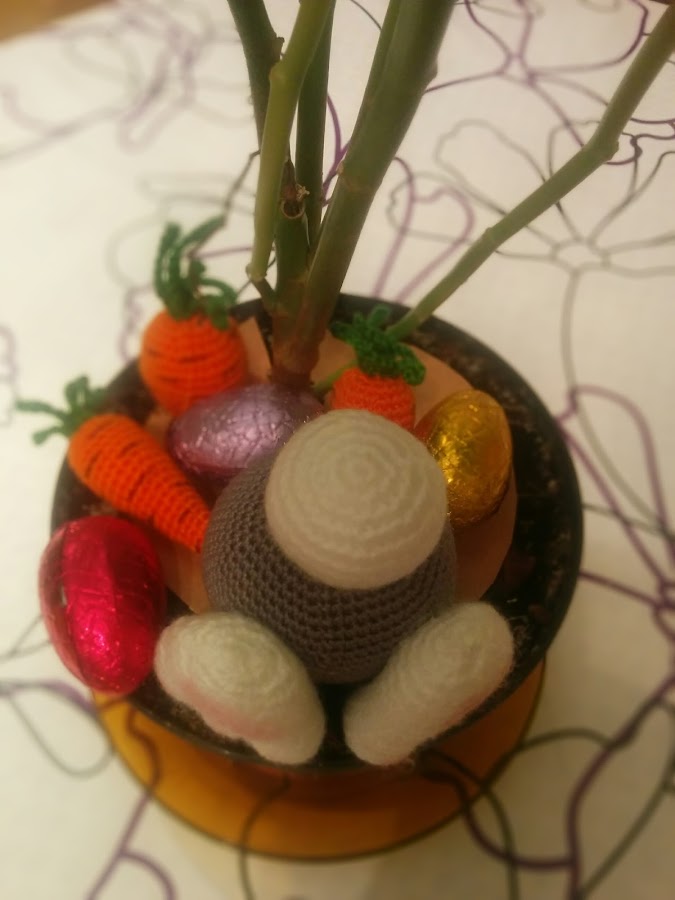 Como os he dicho en el momento que lo vi, decidí que tenia que estar en la decoración de mi casa, es un conejito escondiendo en la tierra unos huevos de chocolate y de paso ha sacado unas ricas zanahorias para recuperarse de este trabajo.