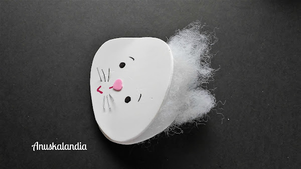 2.- El siguiente paso es montar la cara. Habremos recortado dos piezas de la cabeza. Cogeremos la que va a ser el frente. Nos fijamos en el molde, donde van colocados los ojos, la boca, la nariz y los bigotes. Pintamos los ojos con rotulador permanente negro. Un trocito de goma eva rosa, para hacer la nariz. Alambre fino, para los bigotes. Rotulador rosa o rojo permanente para la boca, que será una V. Pintamos dos cejitas. Con un palito de los oídos o hisopo o cotonete como lo llaman en algunas partes de Sudamérica y un poco de colorete, sí, del que utilizamos para nosotras, le pintamos "coloretes" a la conejita. En los ojos daremos dos puntos de luz con pintura acrílica blanca. Normalmente se da con un marcapuntos, si no tenéis, como los ojos son pequeñitos, lo podéis hacer con un palillo de dientes o la punta del palito de brocheta mojada en la pintura blanca. Bien, ya tenemos la parte delantera de las dos piezas de la cara. Reservamos, como en cocina, la otra parte que será la posterior.