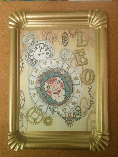 Tenía que pensar otra cosa, como no había manera de ver cómo podía hacer algo decente pensé: "Conchi, lo más sencillo es un collage al uso sin muchas florituras y que sea lo que Dios quiera". Así que con un cartón fino, pegué la lámina de engranajes, pequé el reloj, la "rueda" zodiacal y la cabeza de león recortada y colocada en el medio y unas letras para poner el nombre del signo zodiacal "LEO", recorté y pinté con rotulador dorado y plateado unas cuantas ruedecillas dentadas y las coloqué por el dibujo. Repasé todos los elementos con los rotuladores dorado y plateado.