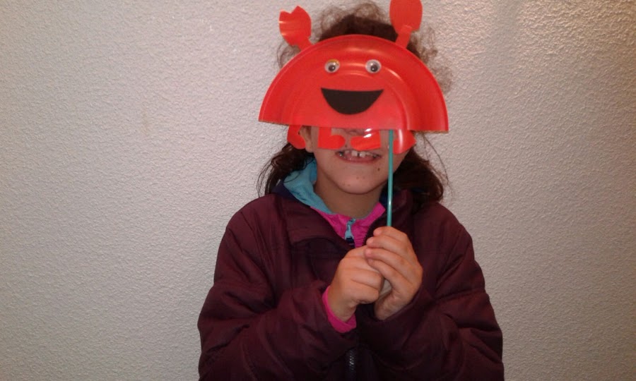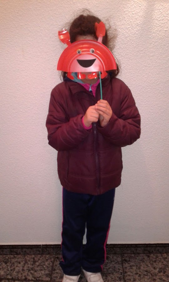 Aquí tenéis a la niña disfrutando y jugando con su mascara de cangrejo futbolista, como ella le llama.