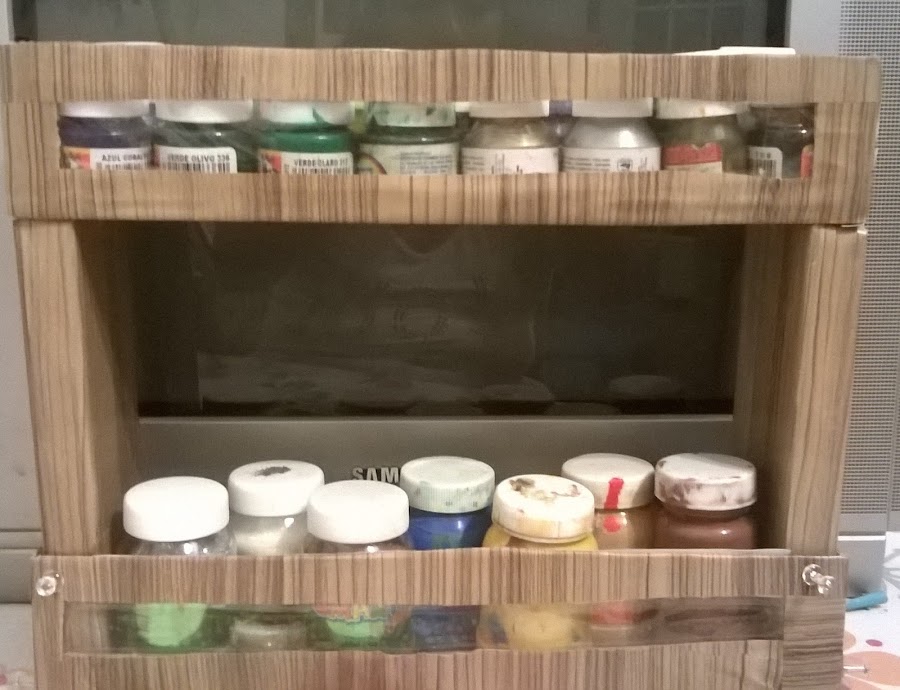 A partir de una pequeña caja de cartón saque las dos estructuras cortando por la mitad, después les hice una ventanilla frontal para poder ver desde fuera los colores, como no tenía acetato le puse cinta adhesiva transparente por ambos lados, las paredes de separación son dos trozos gruesos de poliestireno, finalmente todo forrado con papel contact tipo madera, las he unido con chinchillas para soportar la estructura, el cartón es lo suficientemente grueso para soportar el peso, aún así va reforzado con cinta adhesiva por dentro y por fuera de los fondos