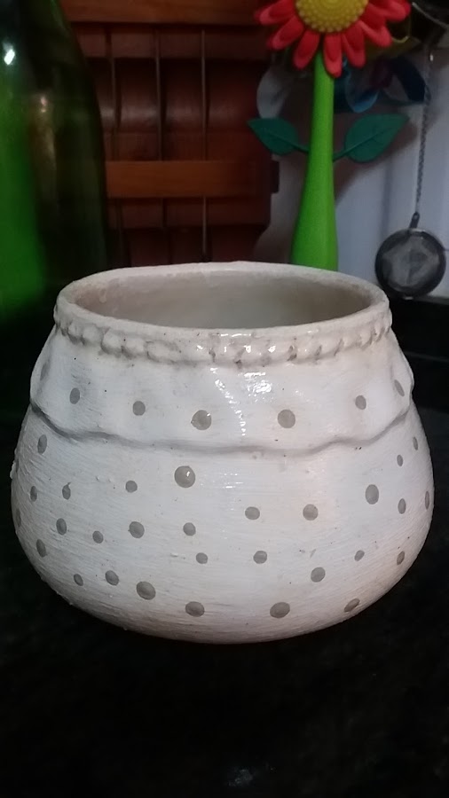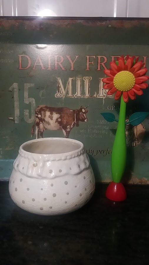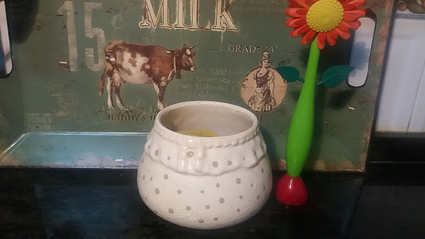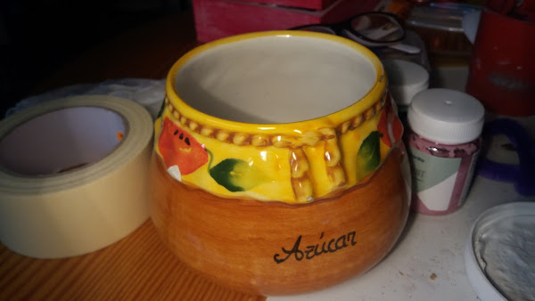 Cuando me casé,se llevaban estos cacharrillos, este era para el azúcar y llevaba su tapa, supongo que se rompería cuando mis hijos eran pequeños. El caso es que me la encontré así, el mismo día que encontré la tulipa con la que hice el velador.