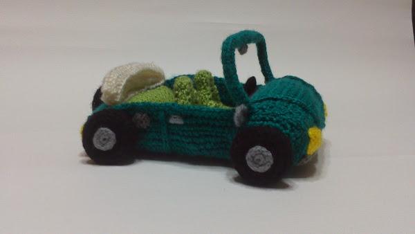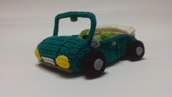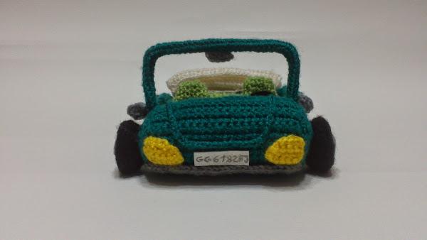El coche ha sido una invención al completo de mi madre, no existe un patrón oficial del mismo, sólo garabatos en una hoja de papel. Espero poder entenderlos cuando los vaya a pasar a limpio ;) Por seguridad, a bebé papa se le ha hecho una sillita para el coche.