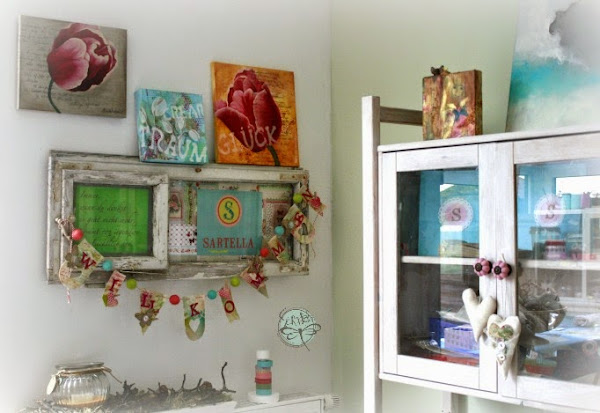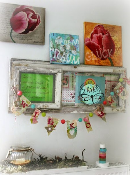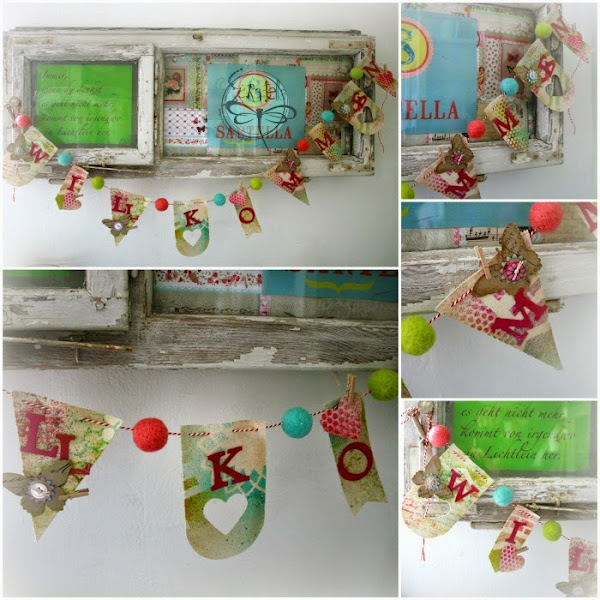 Ahora mis banderines adornan un rincón de mi taller/showroom y estoy feliz con el "Willkommen", muy apropiado un "Bienvenidos" verdad?