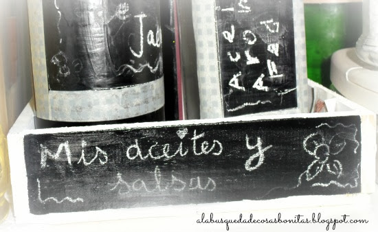 Y para que el resto de aceites, vinagres y salsas quedaran ordenados y agrupados, utilicé una caja de madera, de las de patas de cangrejo que tenía guardada y con su mano de gesso ya dada a la espera de hacer decoupage... Siguiendo con la temática de la pintura de pizarra, pinté uno de los laterales con esta pintura, porque así además, puedo utilizarla para otra cosa si veo que no funciona aquí: