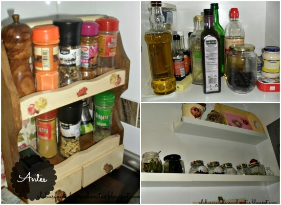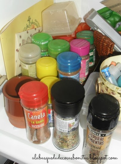 Otra parte lista! Que hasta el mueble que hay encima y que también tenía botes se quedó liberado (que no ordenado, pero hay que ir poco a poco...), porque alguna especia, como el comino en grano, se fue a la basura... No porque estuviera caducada desde el 2006, sino porque la última vez que lo usé fue cuando estaba embarazada de los gemelos, allá por el 2004, que hice un pollo en salsa con cominos y me sentó mal, y desde ese momento es una especia que no aguanto...Así que le dije adiós...